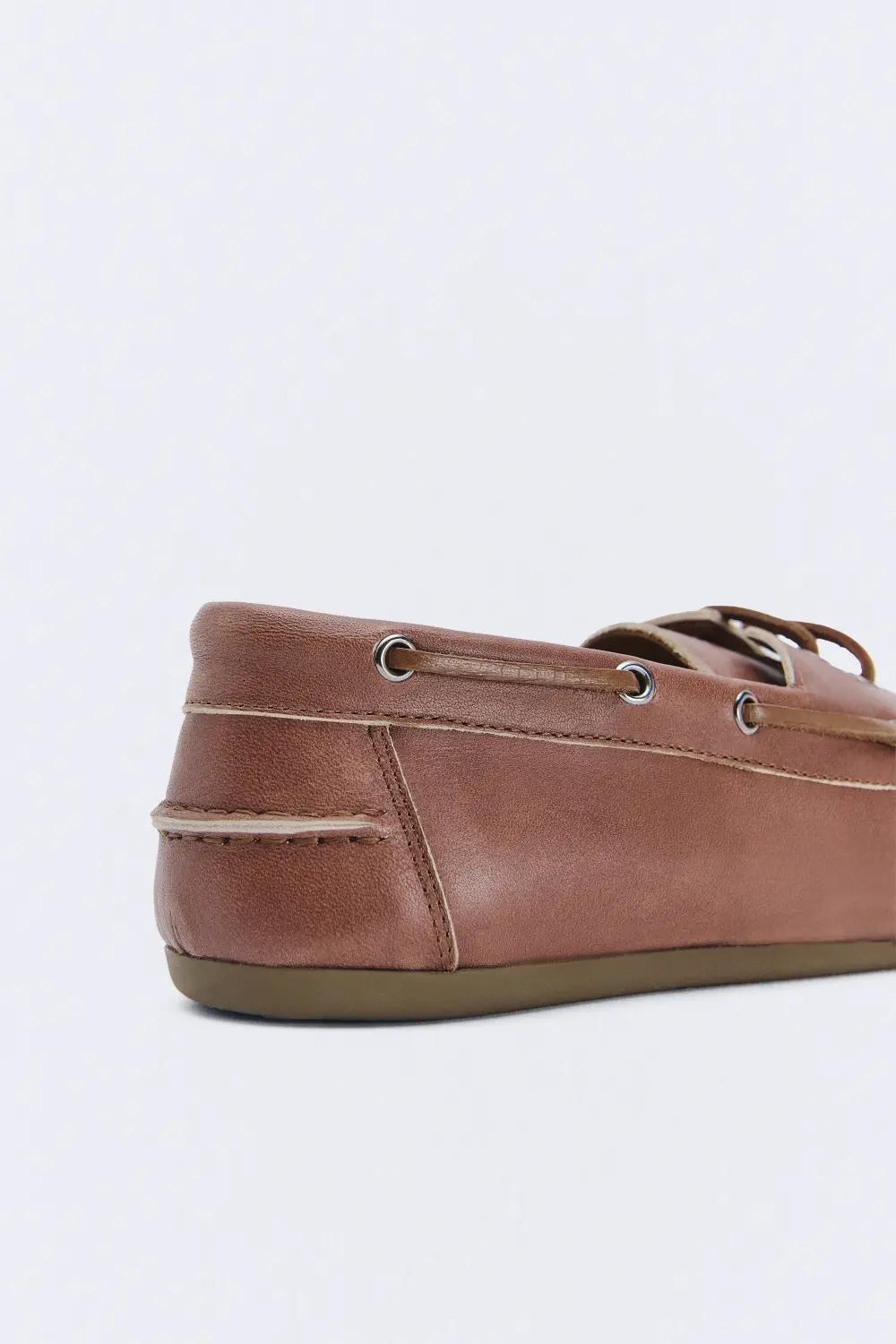 Zapato de estilo náutico de piel. Cierre con cordones y cordón decorativo en los laterales. Punta redondeada. En color marrón.