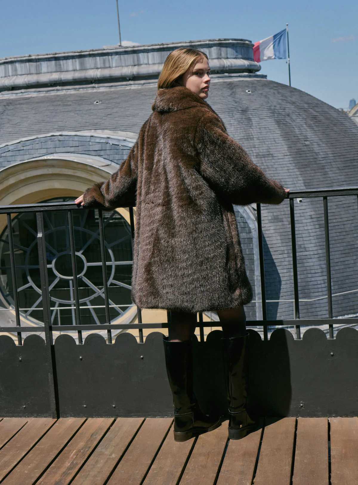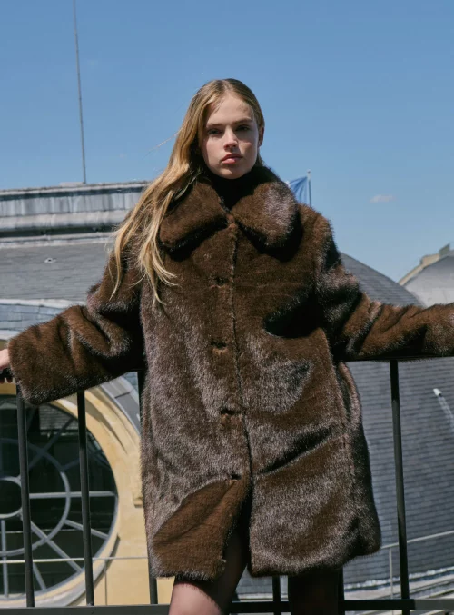 ORSO crea un look acogedor y elegante gracias a su suave y envolvente piel sintética. Su corte oversize y cuello alto la convierten en la prenda perfecta para afrontar el invierno con estilo, añadiendo un toque sofisticado incluso a los looks más sencillos.