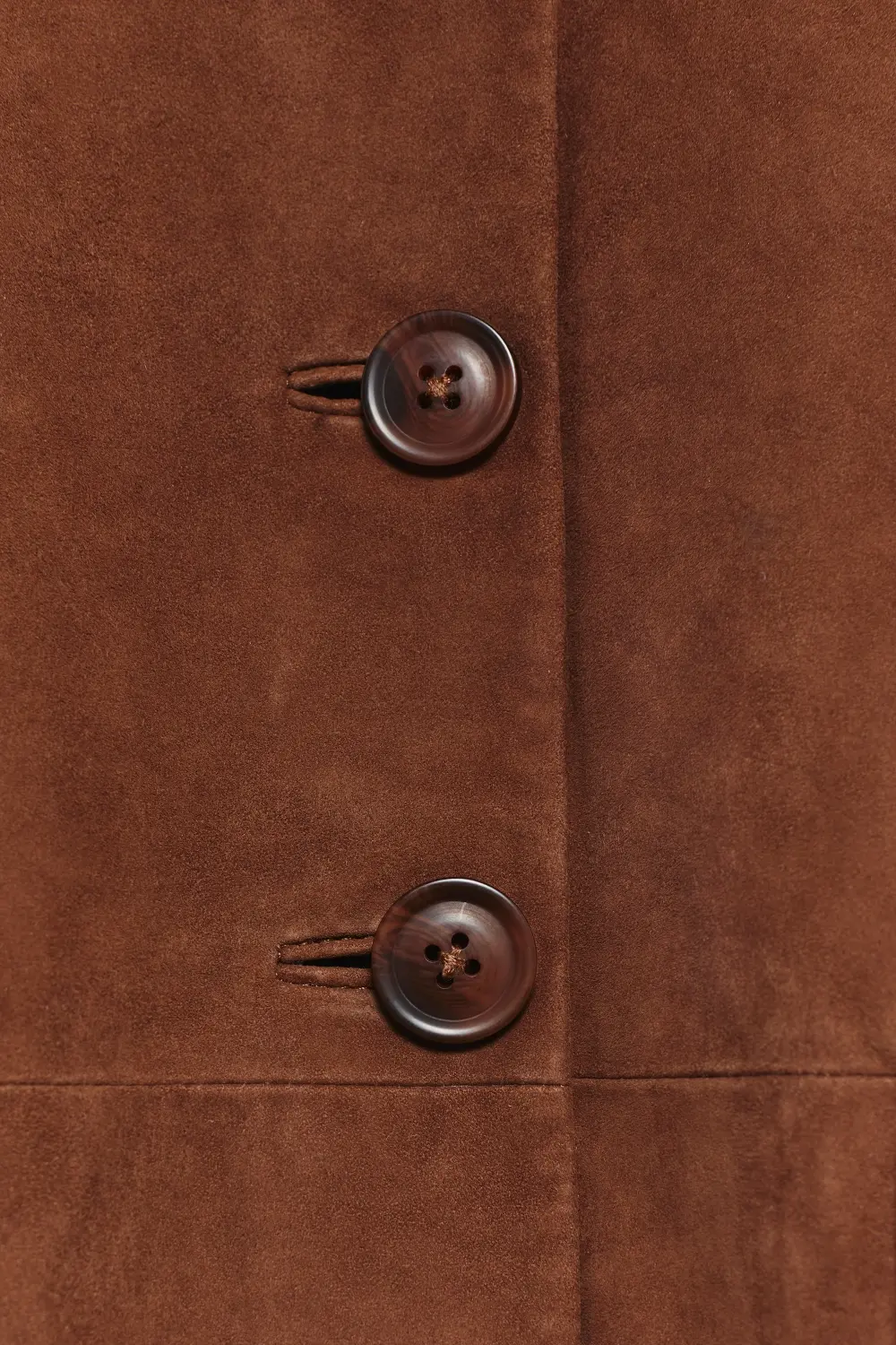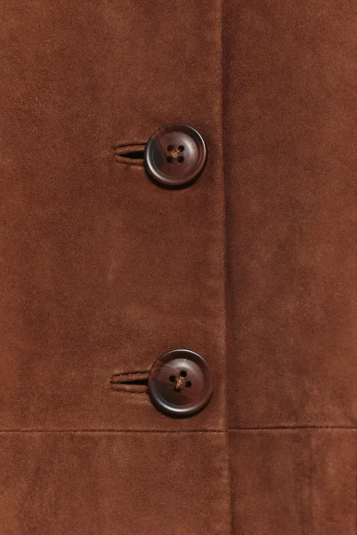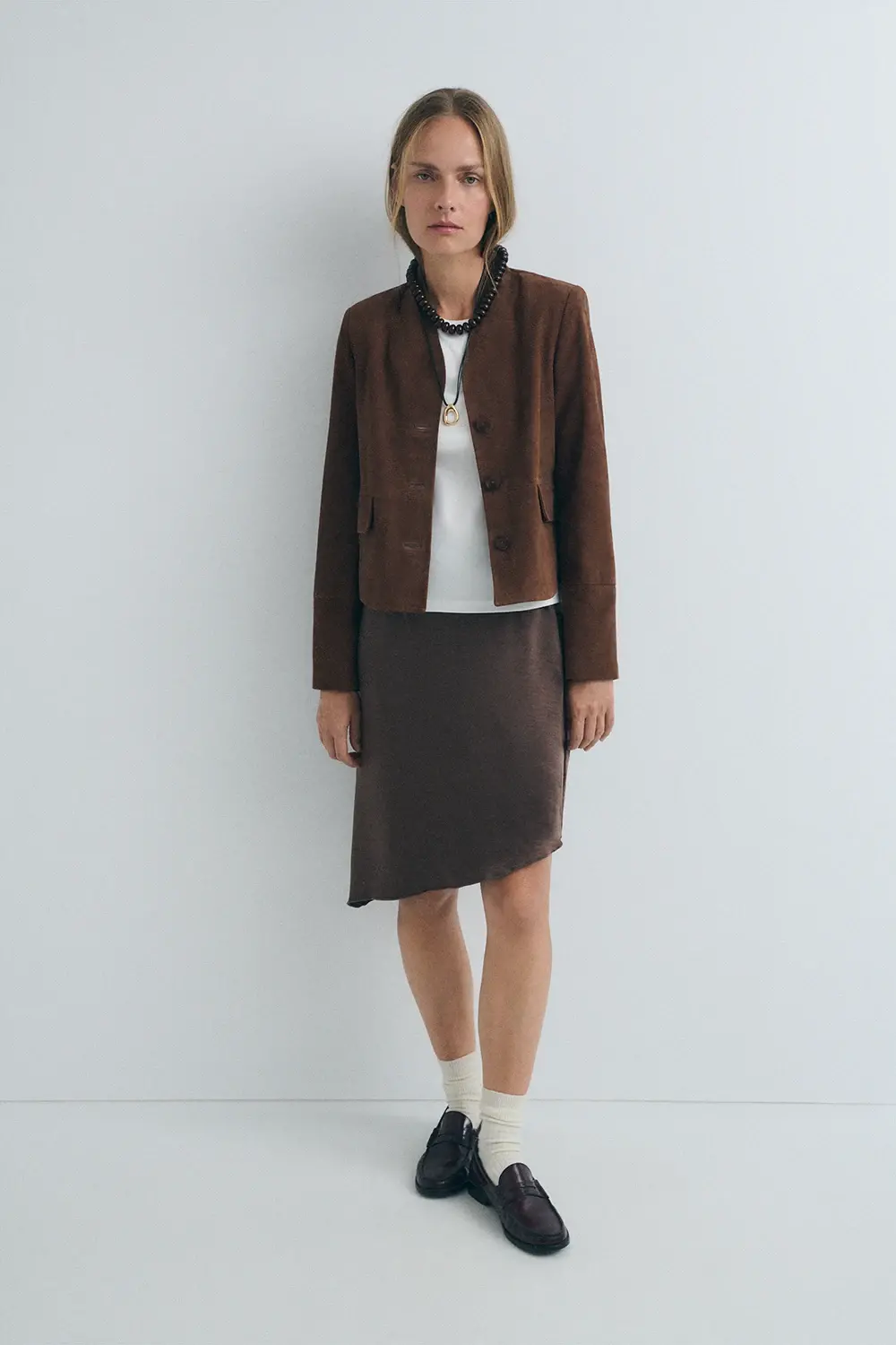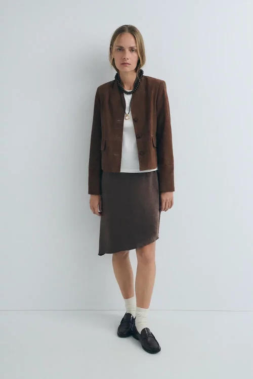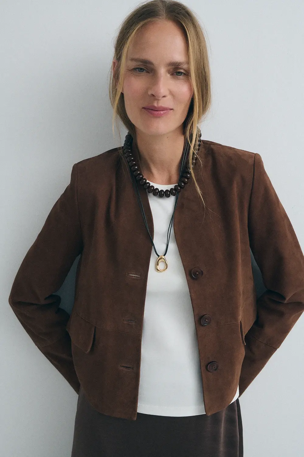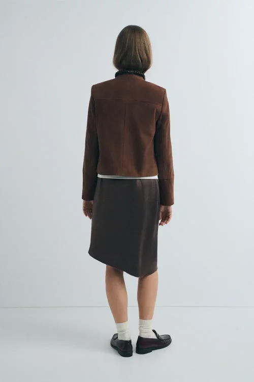 Chaqueta 100% piel serraje. Cuello chimenea. Manga larga. Dos bolsillos cartera. Cierre abotonadura. Forro en satén de poliéster. Certificación Gold LWG. Fitting recto. Funda protectora incluida.