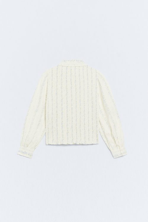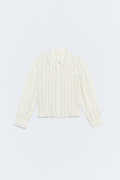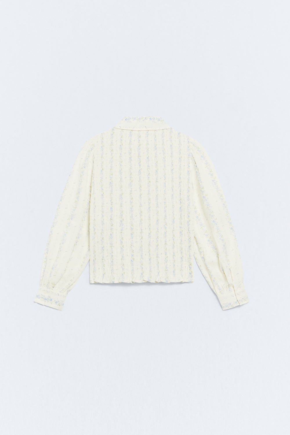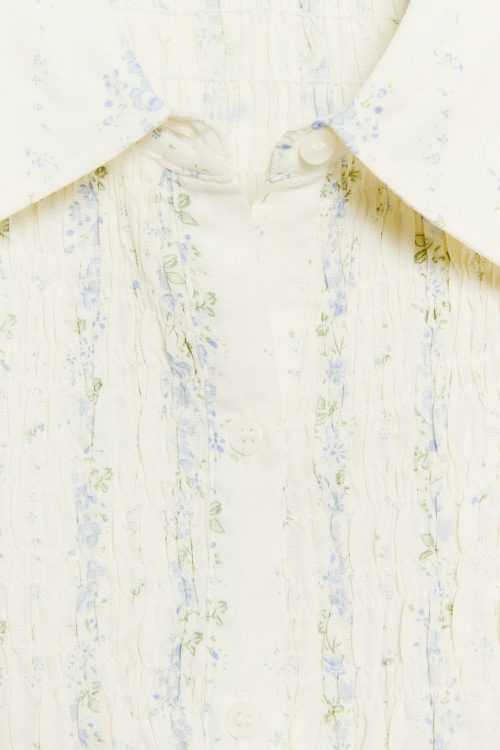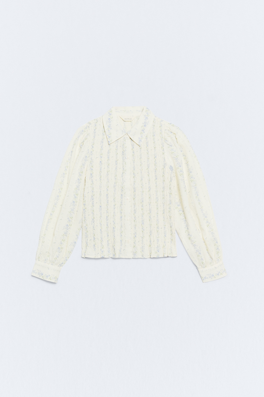 Camisa romántica con estampado. Cuello camisero. Manga abullonada. Tejido del cuerpo con fruncido en relieve