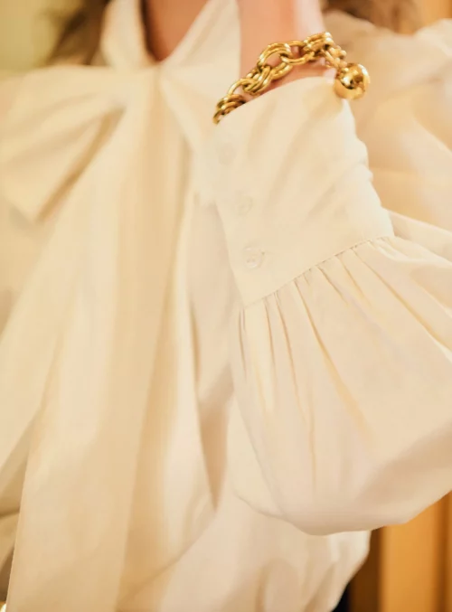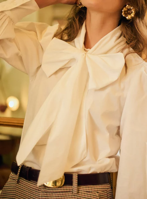 Esta camisa añade un toque de brillo a tus conjuntos gracias a su amplio cuello con lazo. Ideal para la vuelta al cole, combina estilo y dinamismo para empezar la temporada con estilo.
