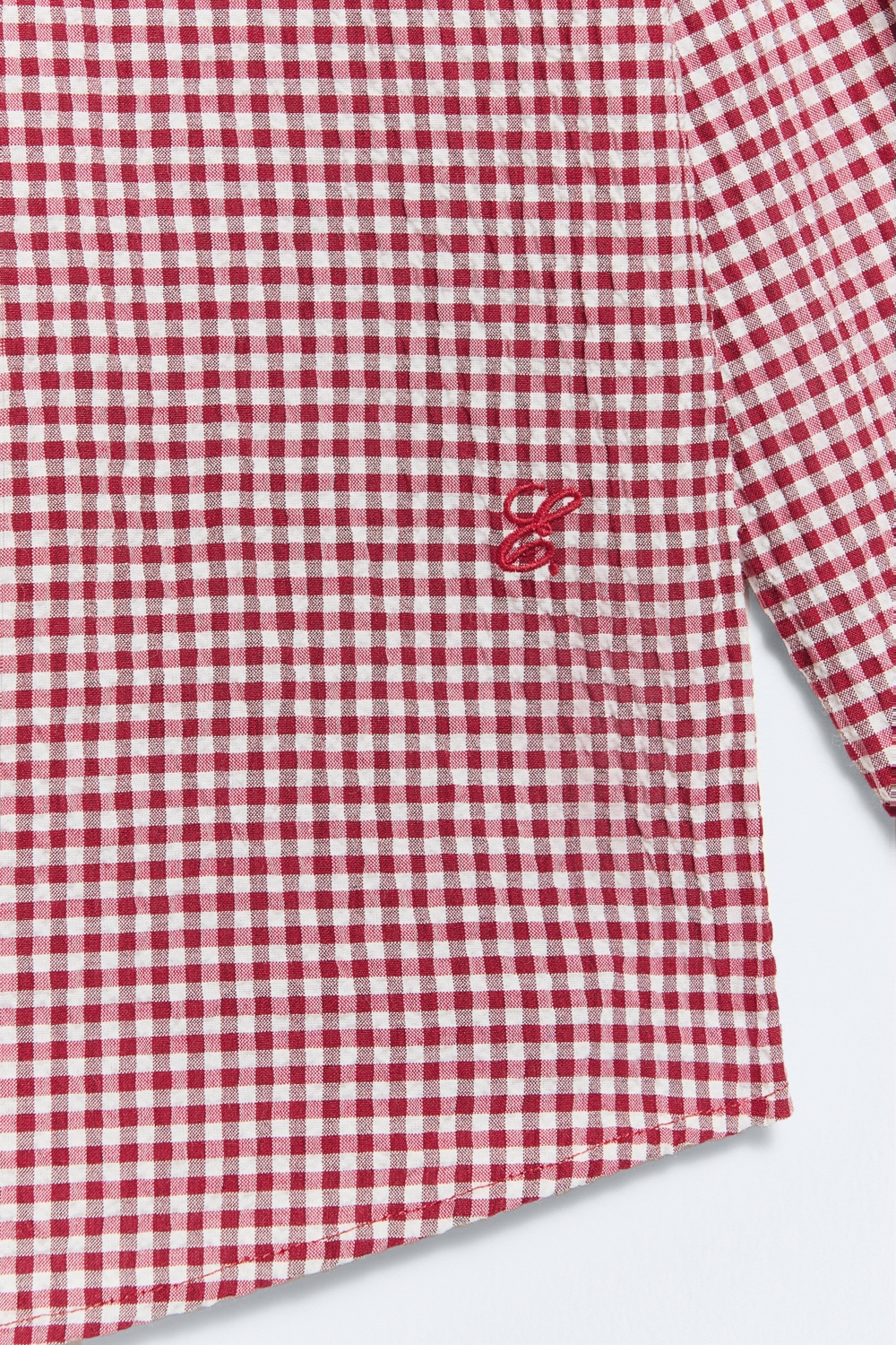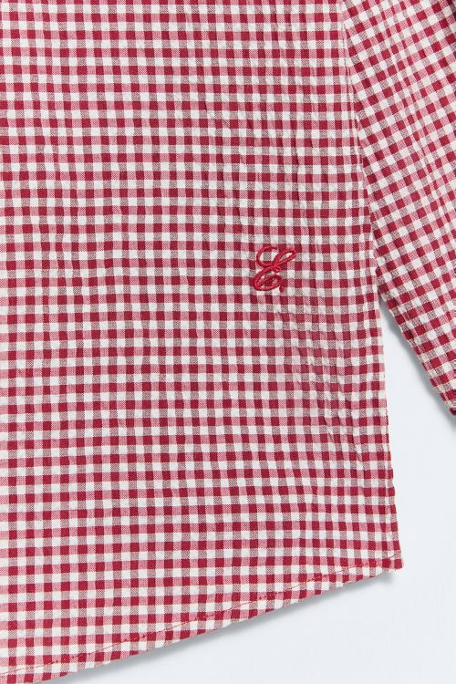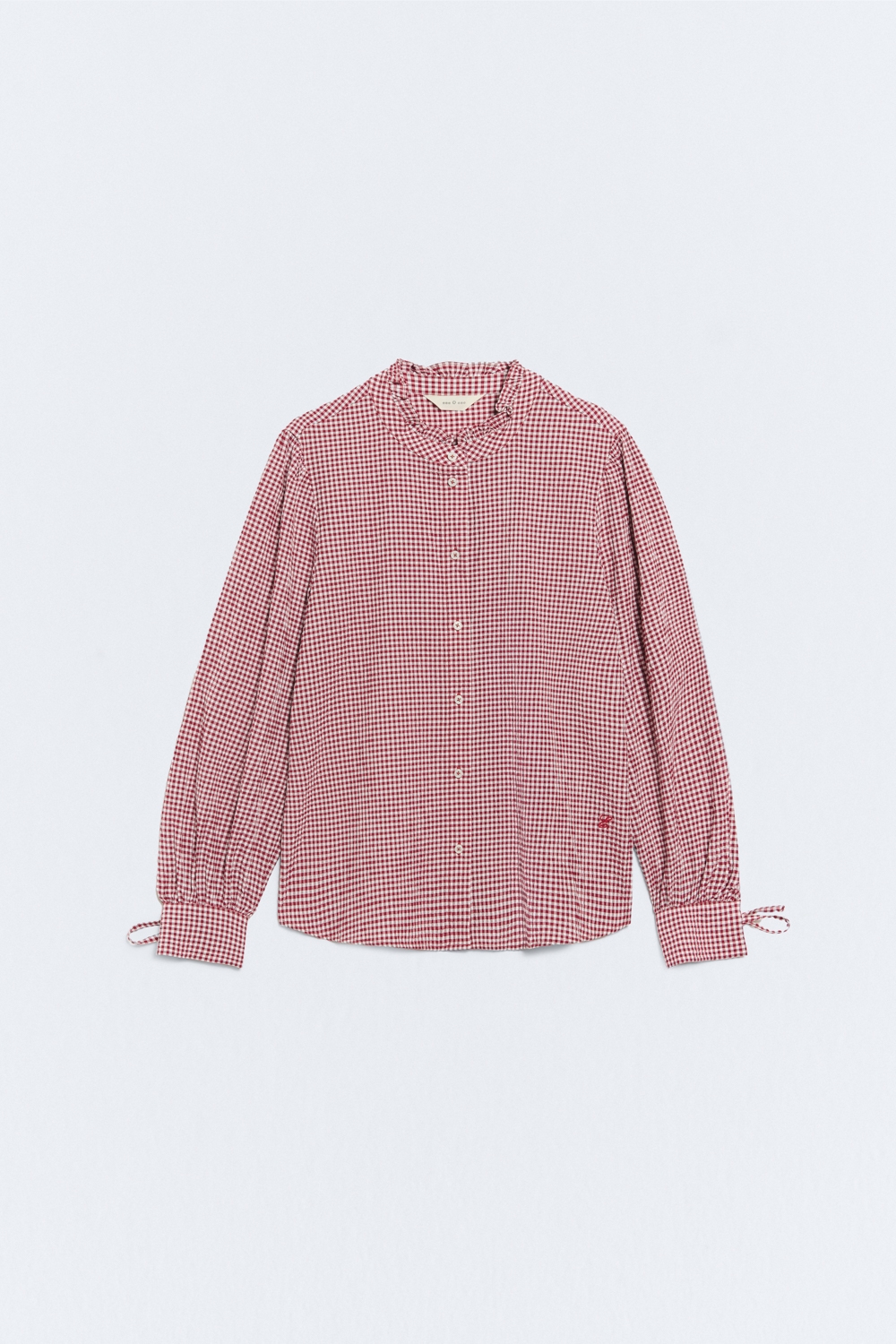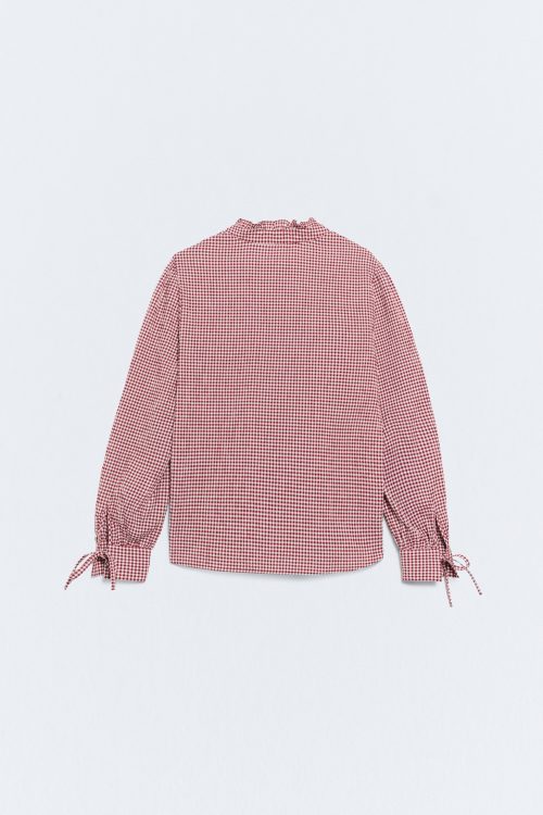 Camisa de algodón BCI. En cuadro vichy rojo. Cuello con detalle de volante. Manga abullonada con lazo en el puño. Cierre central con botones.