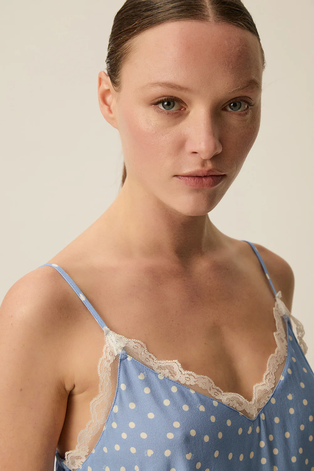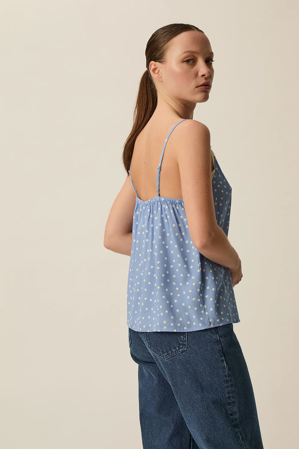 Perfecto para pleno verano, el top Toutou encarna la tendencia de lencería diurna con elegancia y modernidad. Confeccionado en crepé de viscosa fluido, sus icónicos lunares, delicados tirantes y un escote con ribete de encaje crean una silueta ligera y femenina, realzada por una espalda abierta.