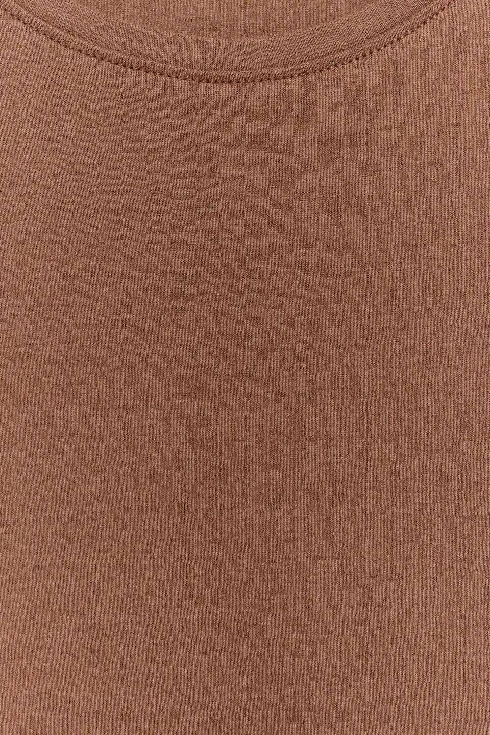 Camiseta de manga corta hecha de 100% algodón orgánico. Con textura crepada. Fitting ajustado. Cuello redondo. En color tostado.
