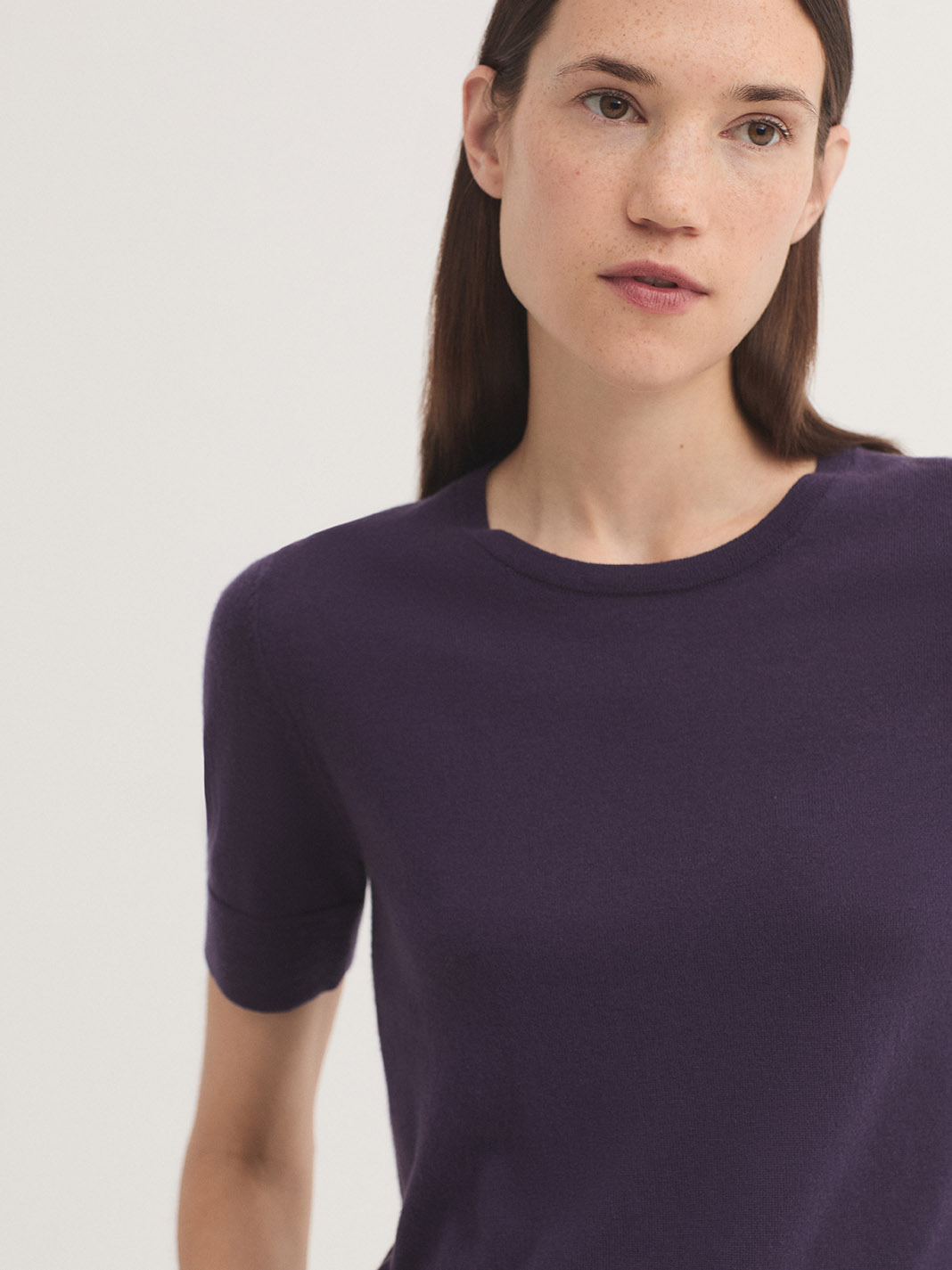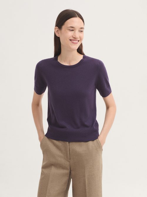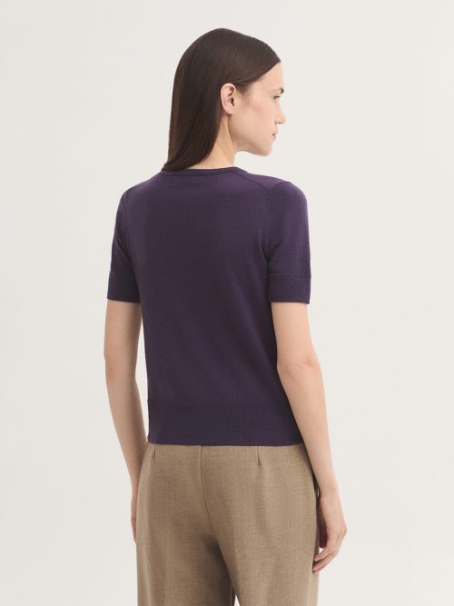 Jersey básico de manga corta en lana merino. Cuello redondo y acabados en ribete.