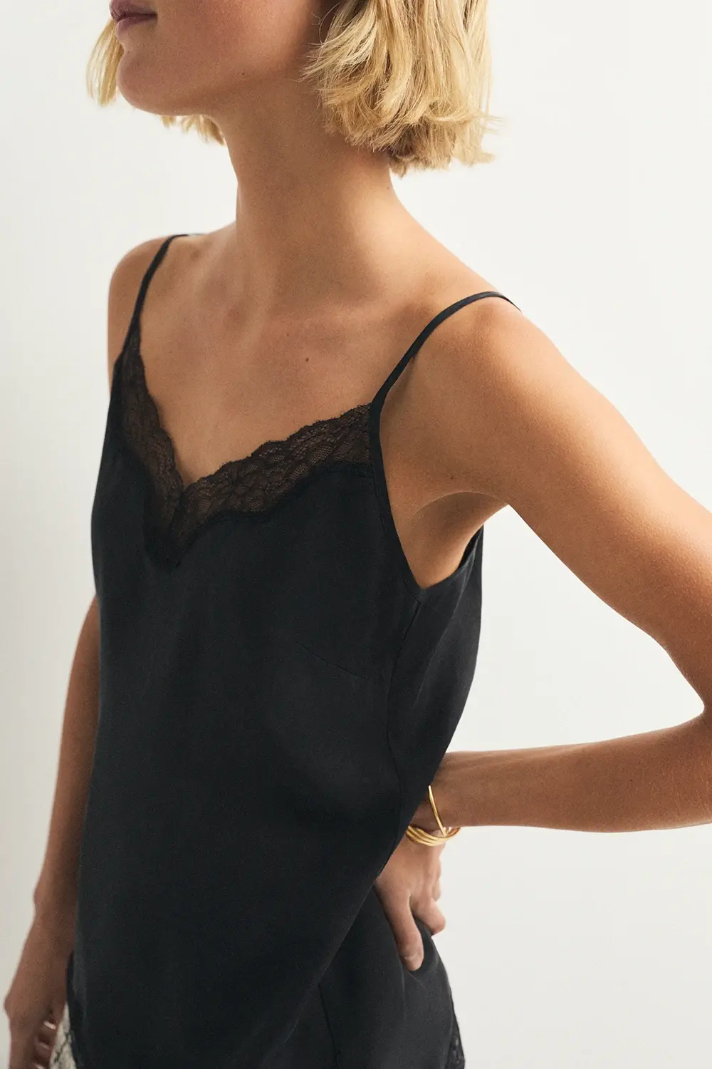 El top Yvette es una prenda ligera y femenina con composición de cupro que combina suavidad y ligereza, en color negro. Diseñado con tirantes regulables y detalles de blonda en el escote y en el bajo, ofrece un acabado elegante y romántico. El top Yvette se convierte en un básico versátil para crear looks sencillos, sofisticados y delicados.