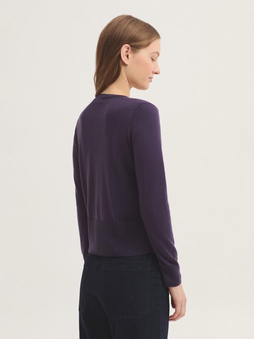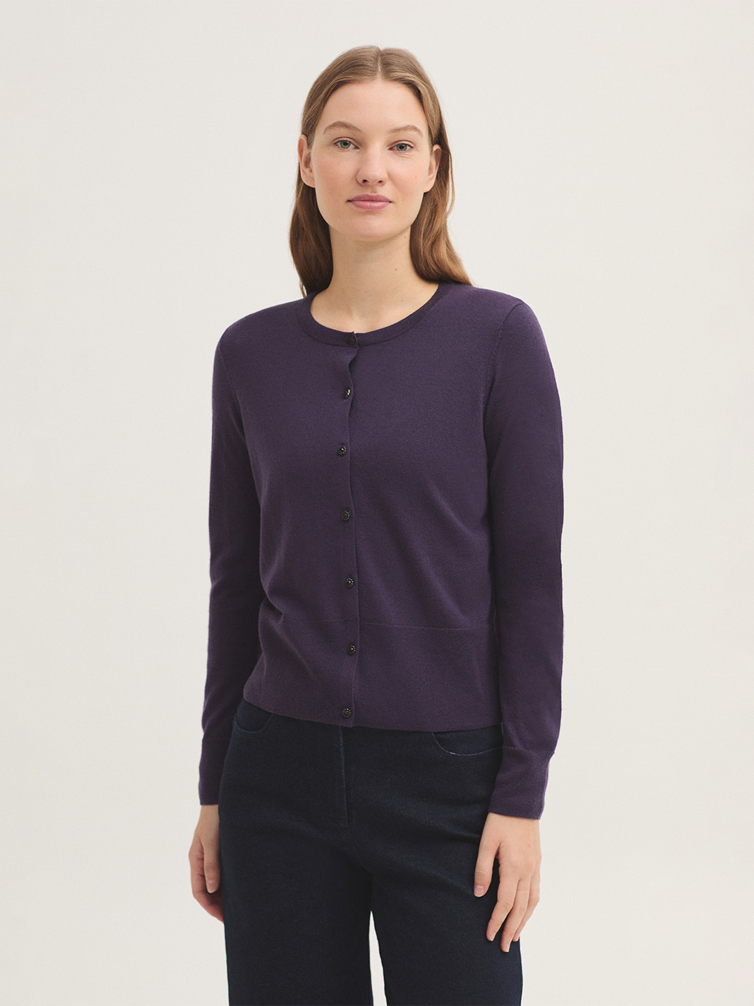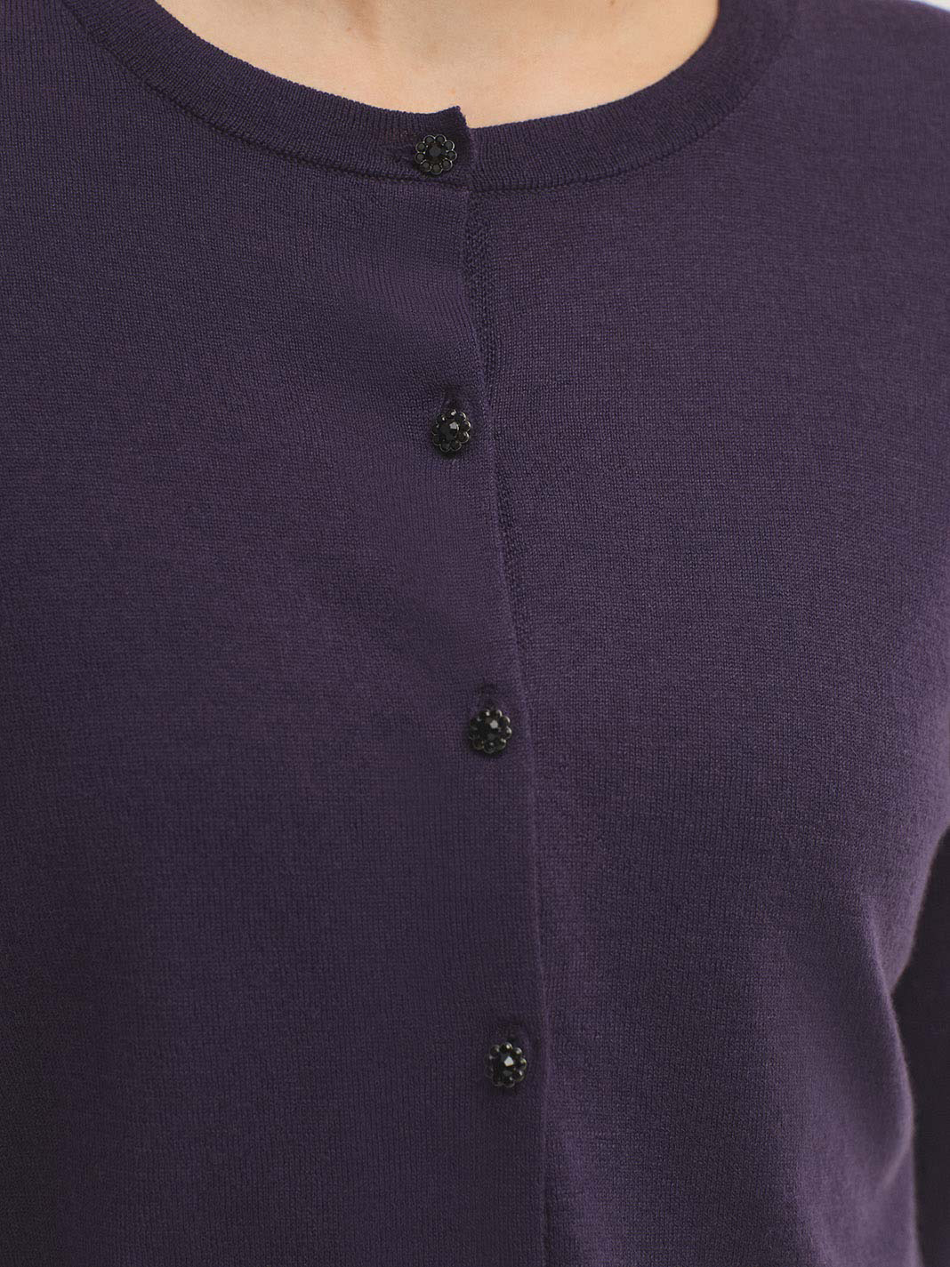 Chaqueta básica en lana merino con botones joya. Cuello redondo, manga larga y acabados en ribete.