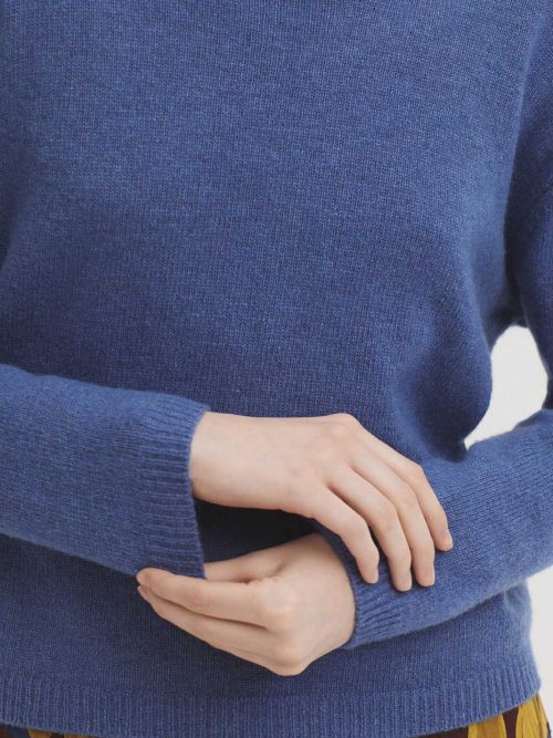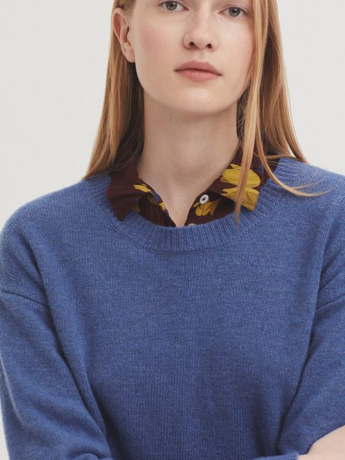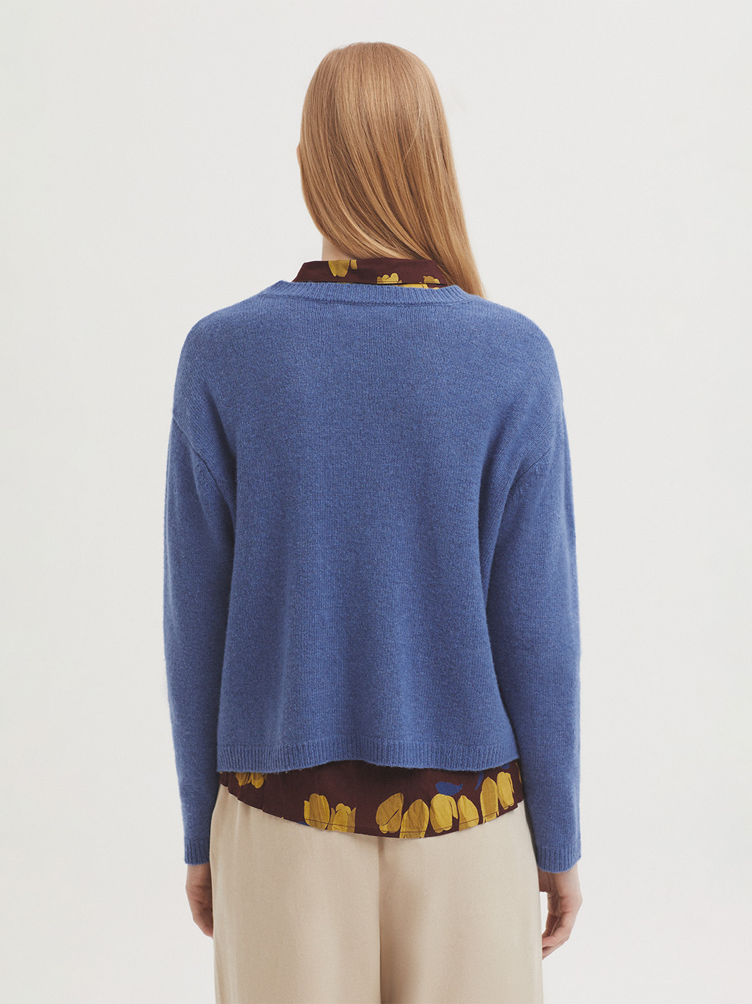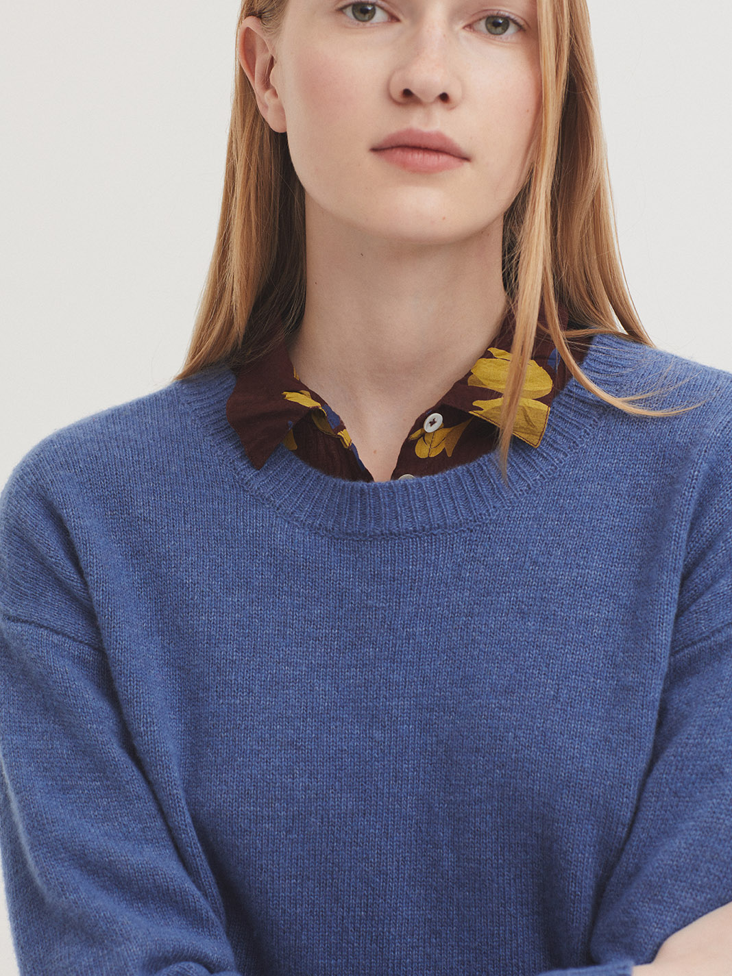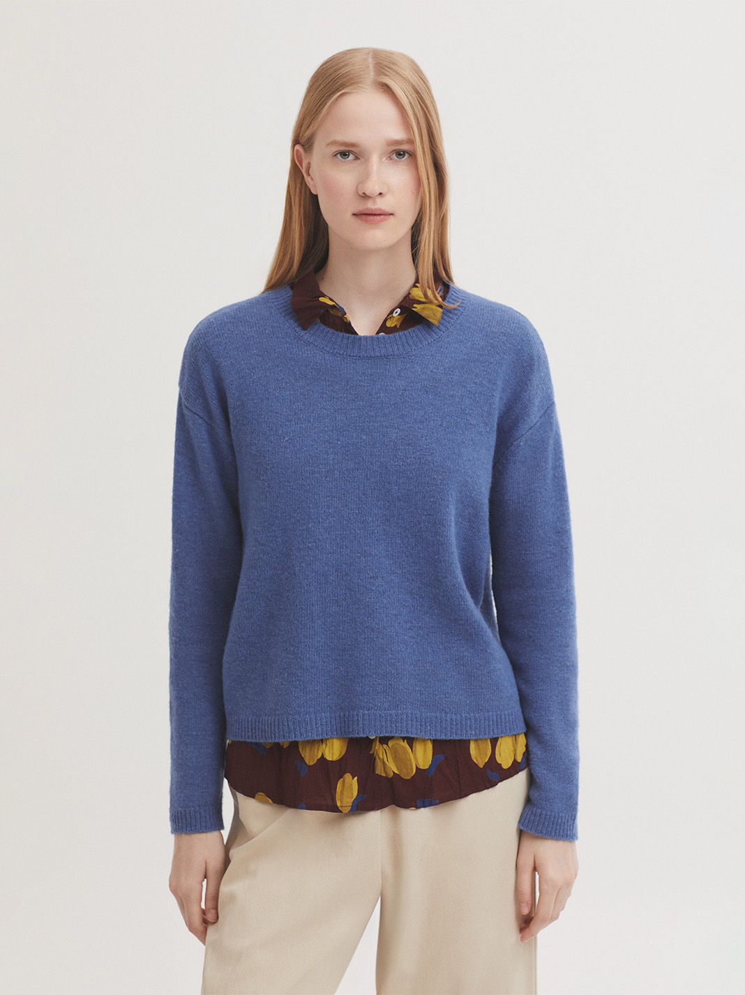 Jersey básico en lana con cuello redondo, manga larga y acabados en ribete.
