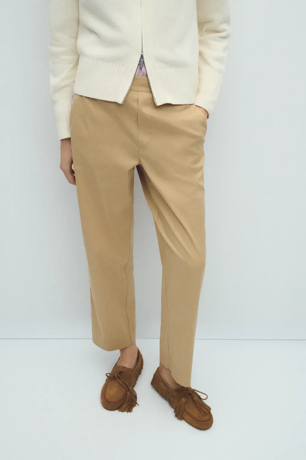 Pantalón de tiro alto de largo tobillero. Corte recto tipo chino. Con composición de algodón. Bolsillos delanteros en diagonal. Con goma en la parte trasera. Sin cierre. En color camel.