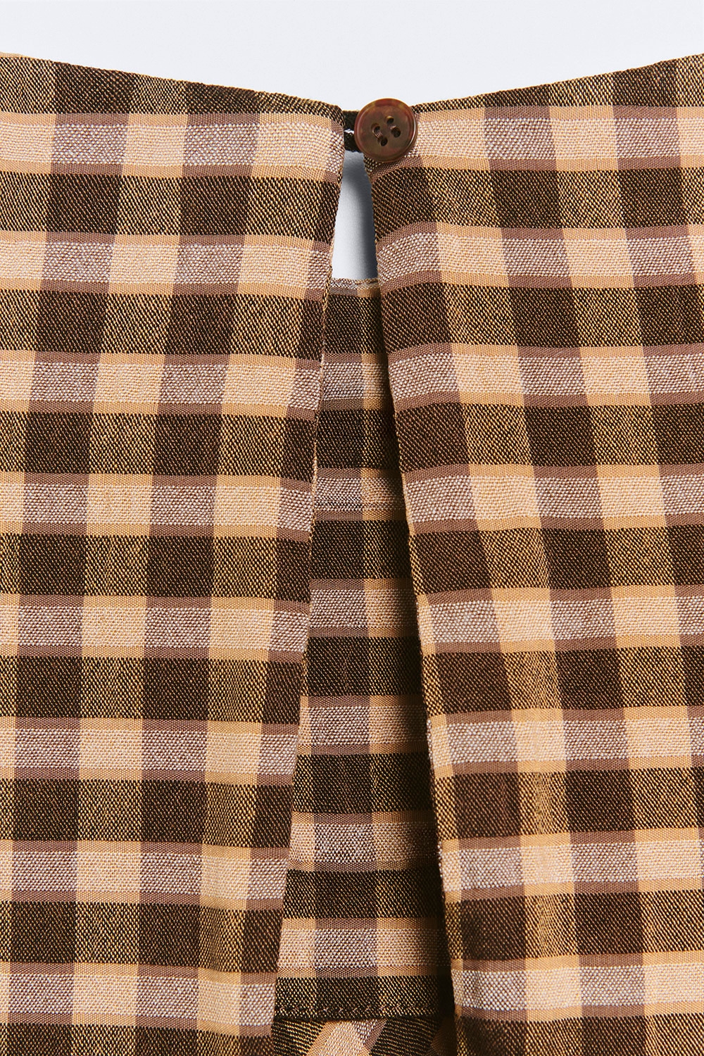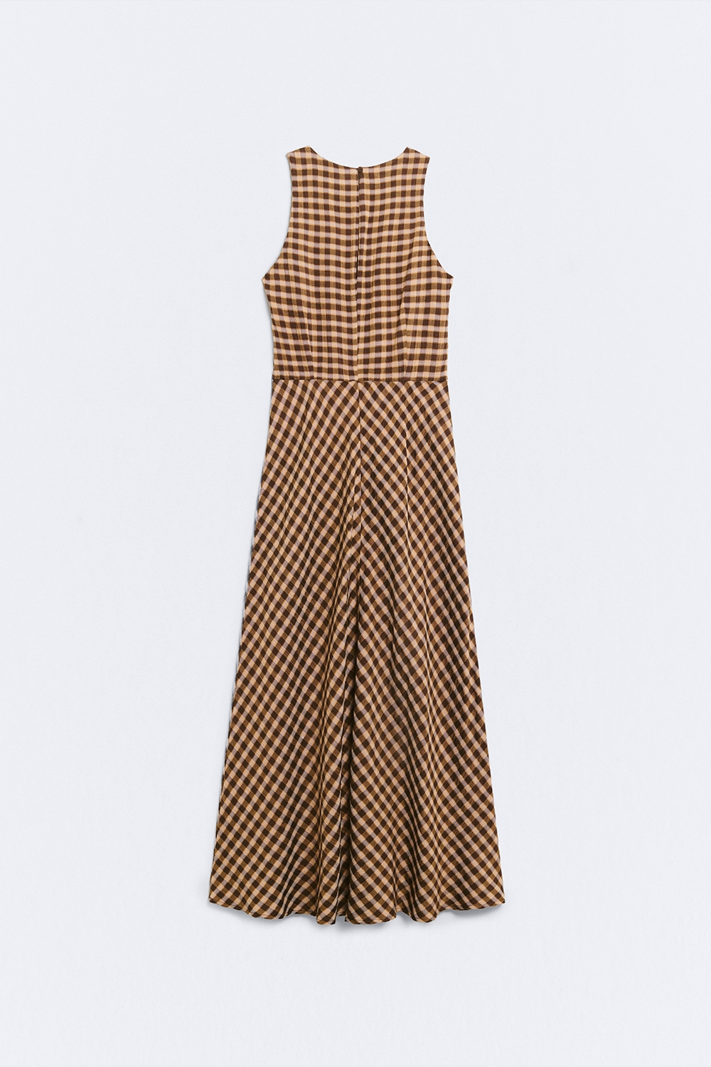 Vestido de tirantes fluido con estampado de cuadros. Escote redondo. Detalle fruncido en la cintura. Falda evasé al bies. Sin forro. Cierre con cremallera. Fitting entallado.