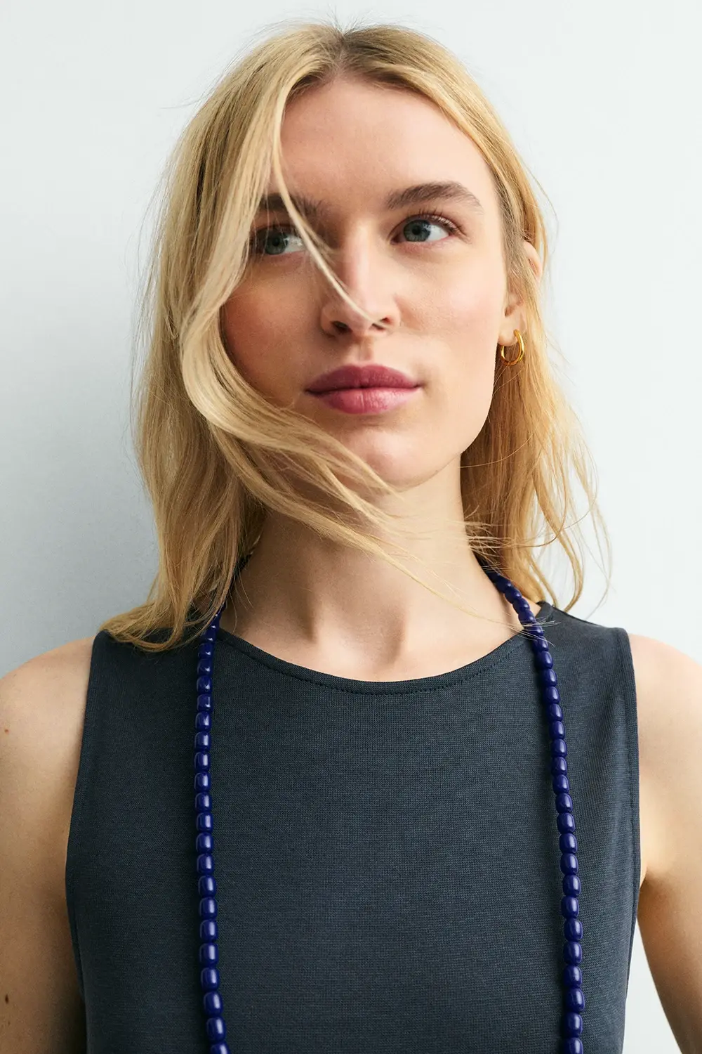 El vestido Pompeia es una prenda fluida y ligera confeccionada en punto cortado de alta calidad, que combina comodidad y movimiento en un tono azul índigo.